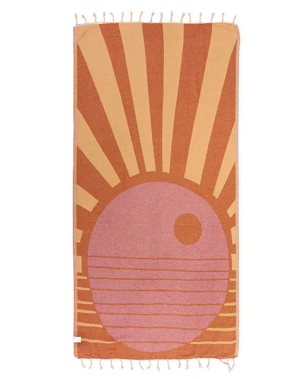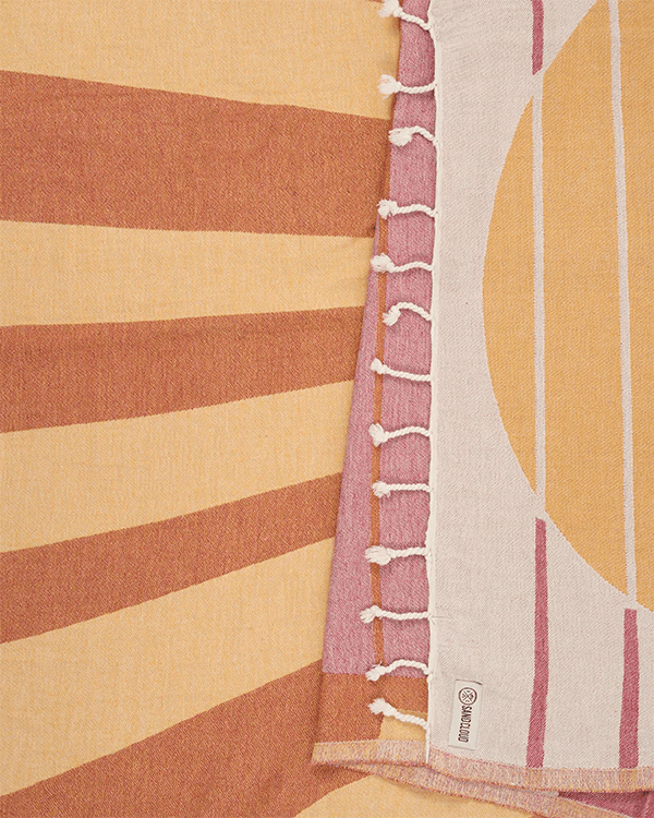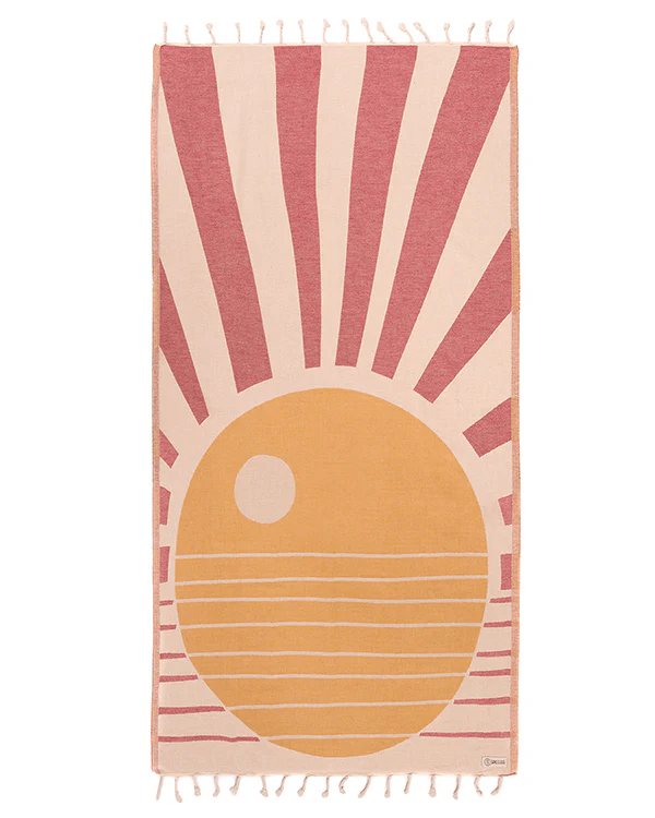 Sunset design, made from Turkish organic cotton for a softer hand feel and a better sustainable product Regular size Jacquard weave Twisted tassels Quick dry and repels sand Approx. 37" x 67" (93cm x 170cm) 100% Turkish Organic Cotton Made and Loomed in Turkey