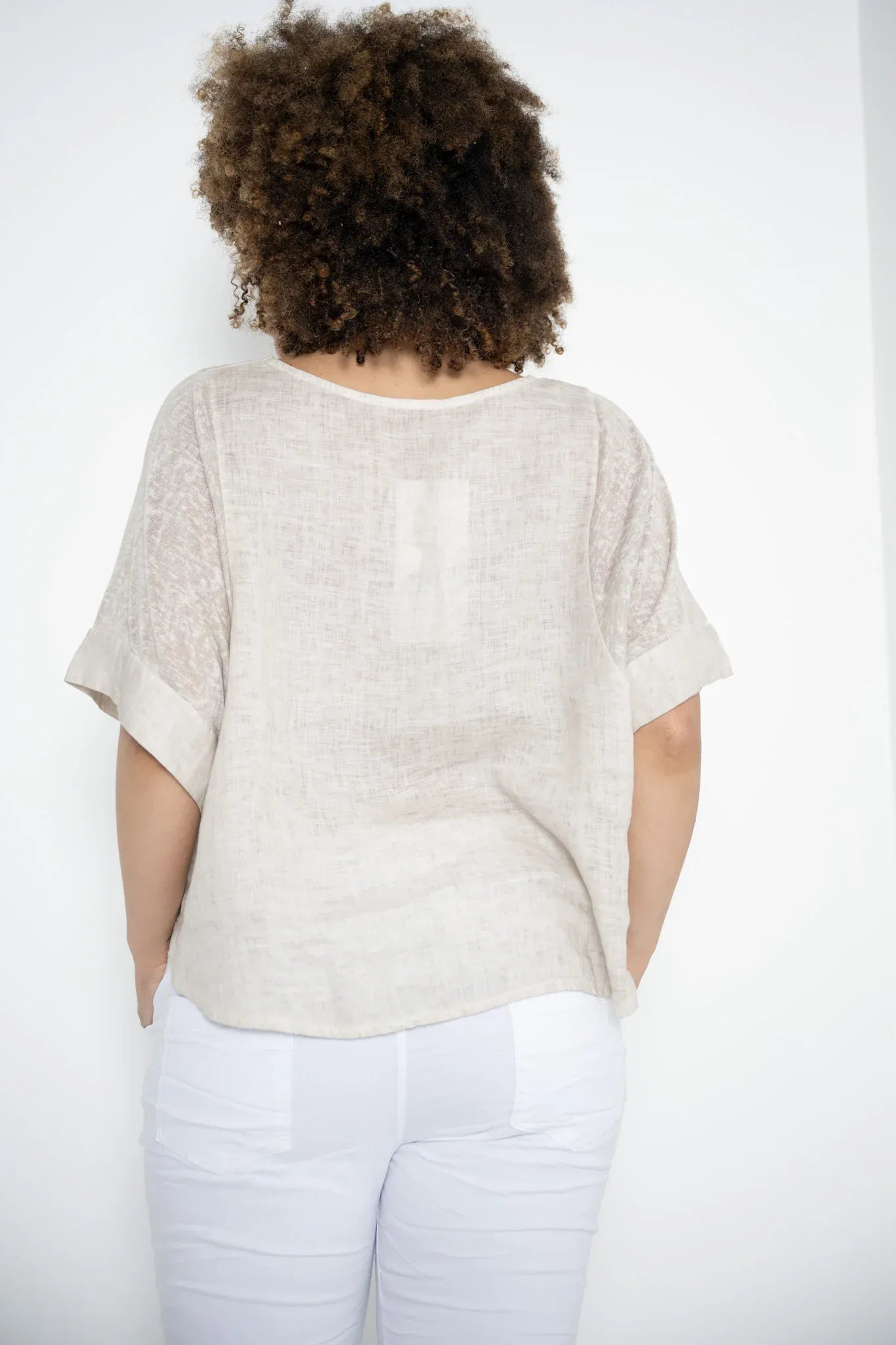 What sets the Lucia apart are its batwing sleeves—made from a delicate, slightly sheer polyester that adds a subtle, airy contrast to the linen. Each sleeve is finished with a wide linen band, grounding the lightness with structure and harmony.