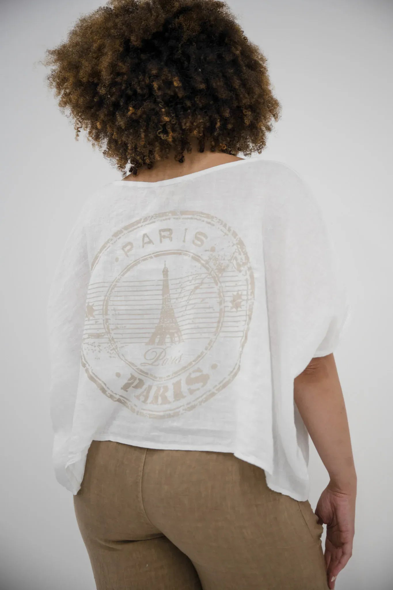 Its batwing sleeves and cropped hemline create a modern, flowing silhouette that can be worn casually or styled off the shoulder for a more laid-back, romantic feel. But it’s the back that truly sets this piece apart—a bold, oversized emblem featuring the word Paris and the Eiffel Tower, stamped in a round, branded-style design that brings an unexpected edge to its natural simplicity.
