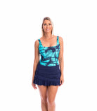 Togs swim skort with frill detail in navy. This swim skort is the perfect cover up in and out of the water it features flattering frill detail along hem and on the front and built in boyleg pant.