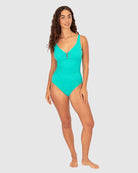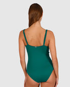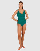 Baku's Rococco D/E Ring Front One Piece Swimsuit features a flattering dropped neckline with a tortoise shell ring at the front. It has hidden underwire with power mesh stability, boning and continuous shelf support. It also features a soft edge front, adjustable straps, tummy control & ruching and is fully lined.