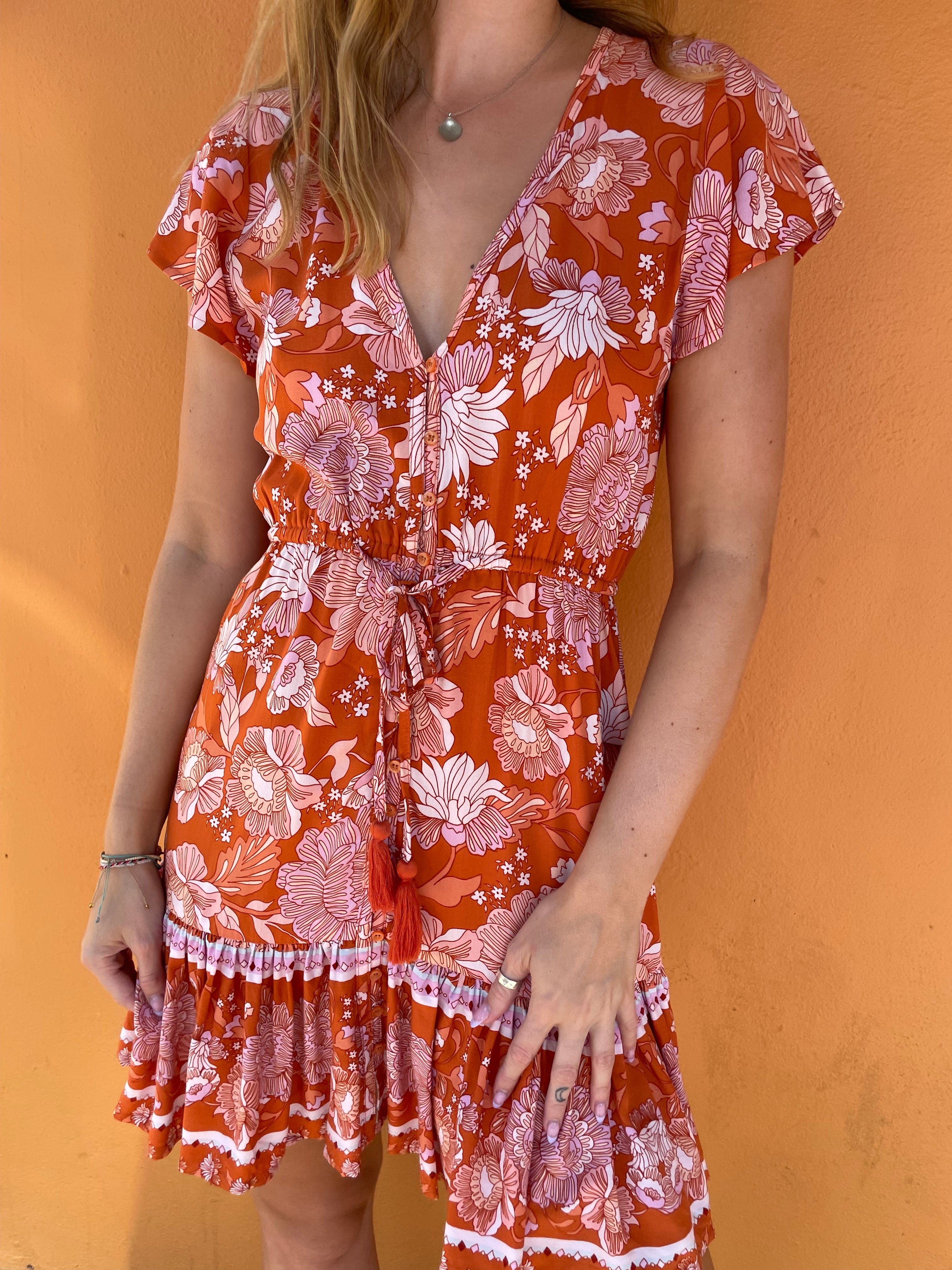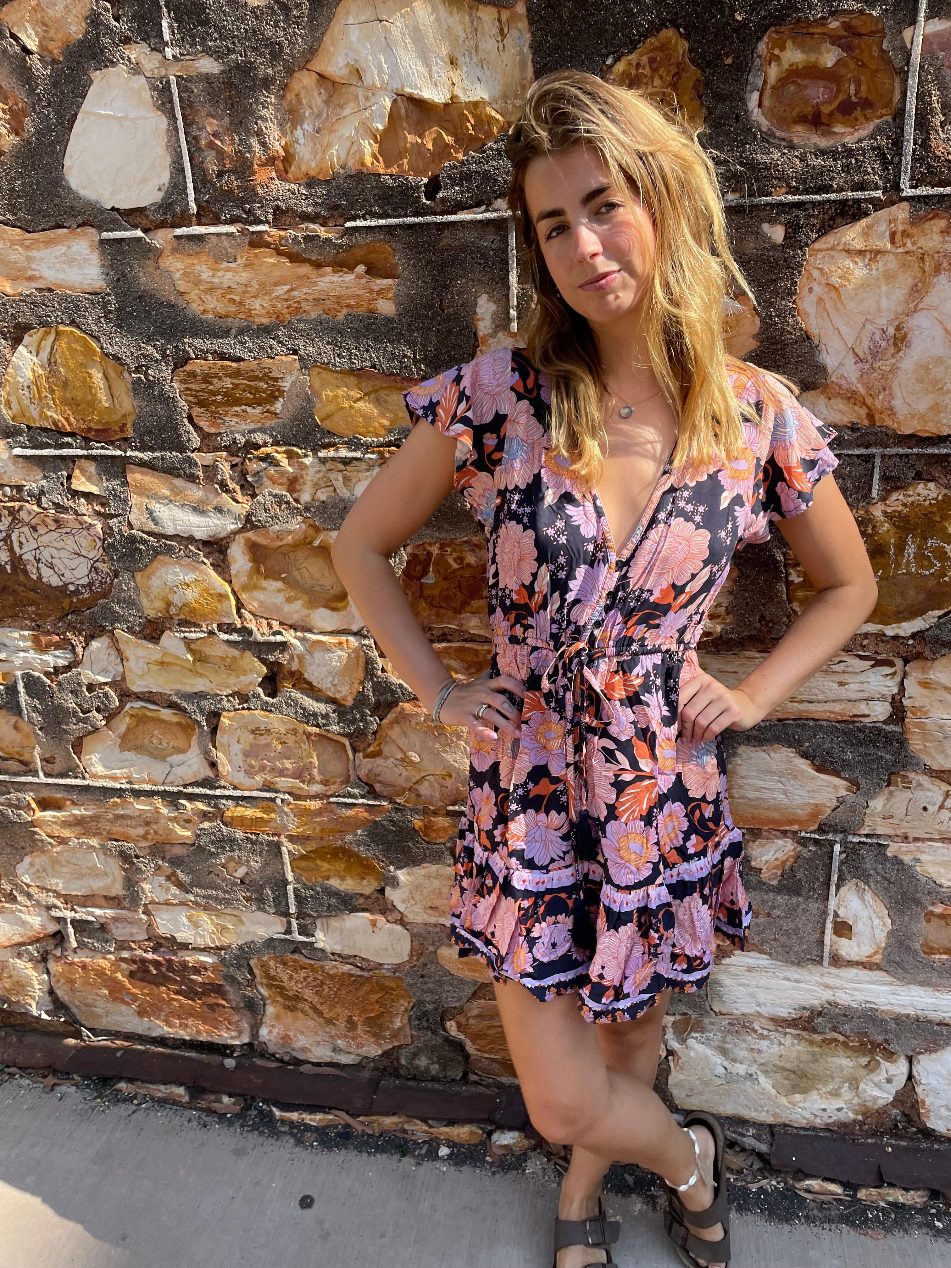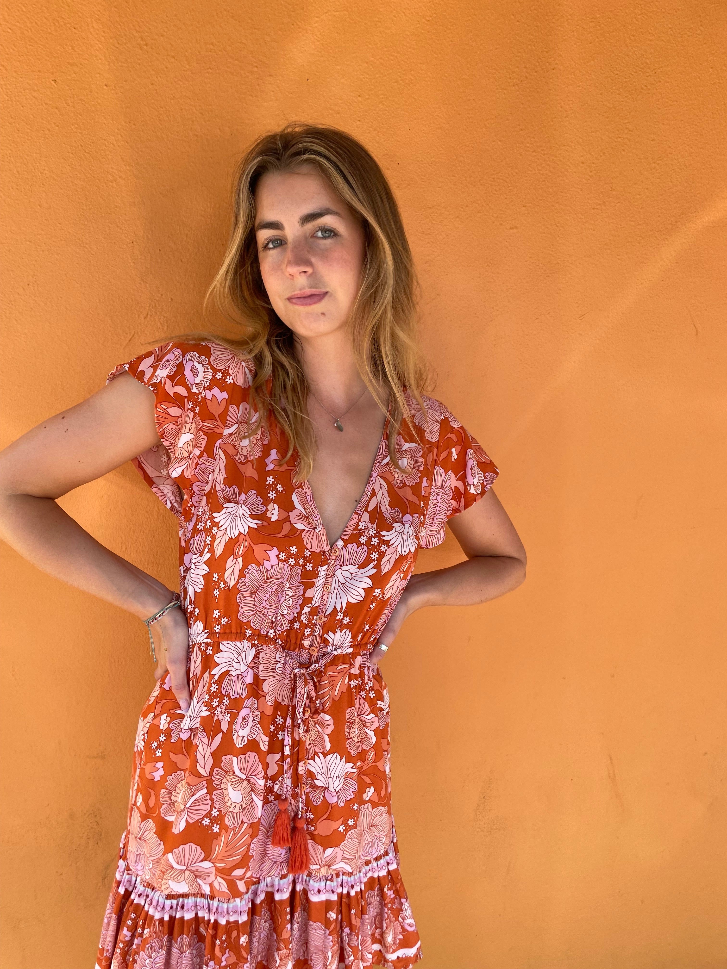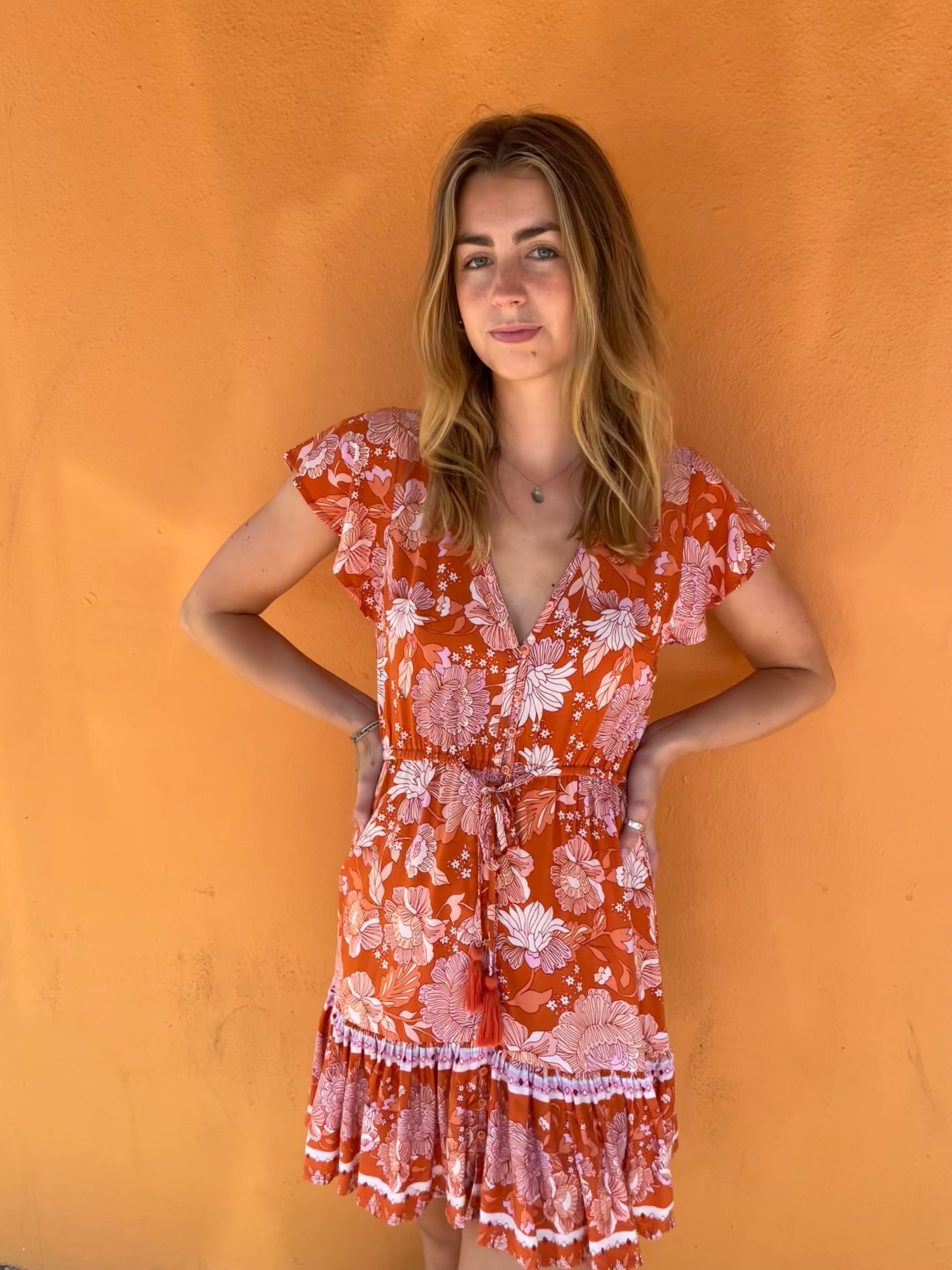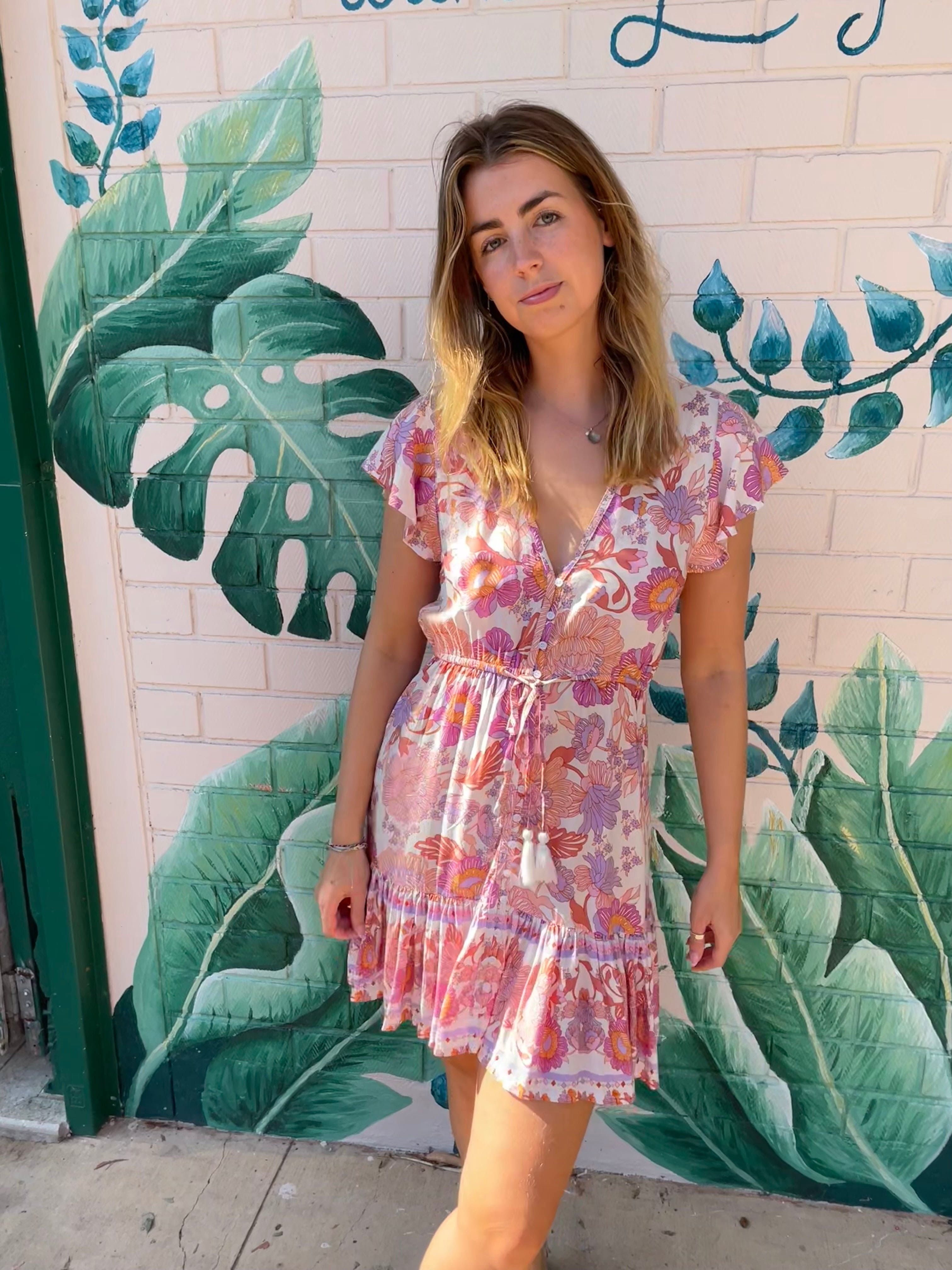Our ever so popular Gypset dress has a drawstring waist and beautiful floaty hem with soft flutter sleeves.