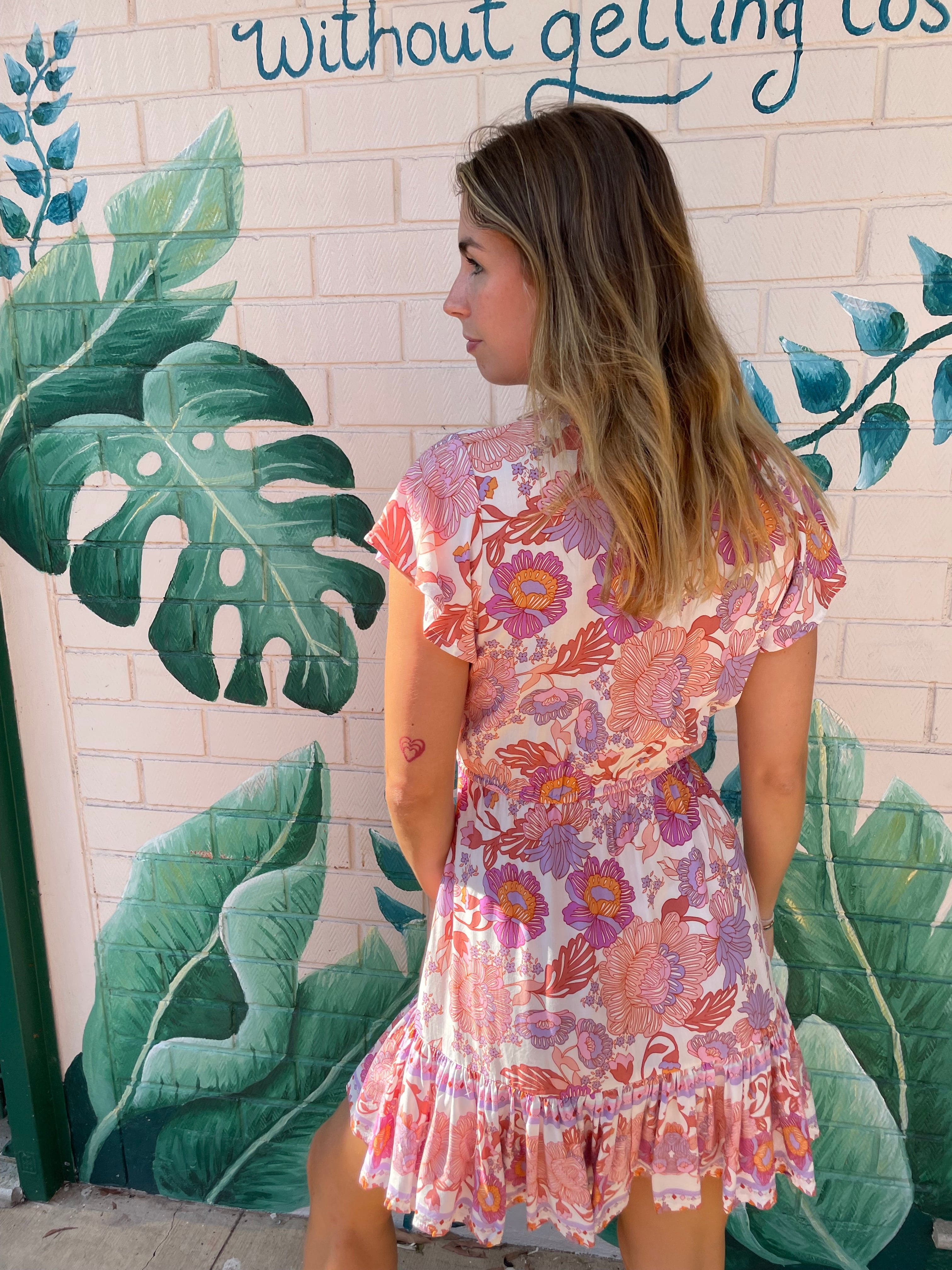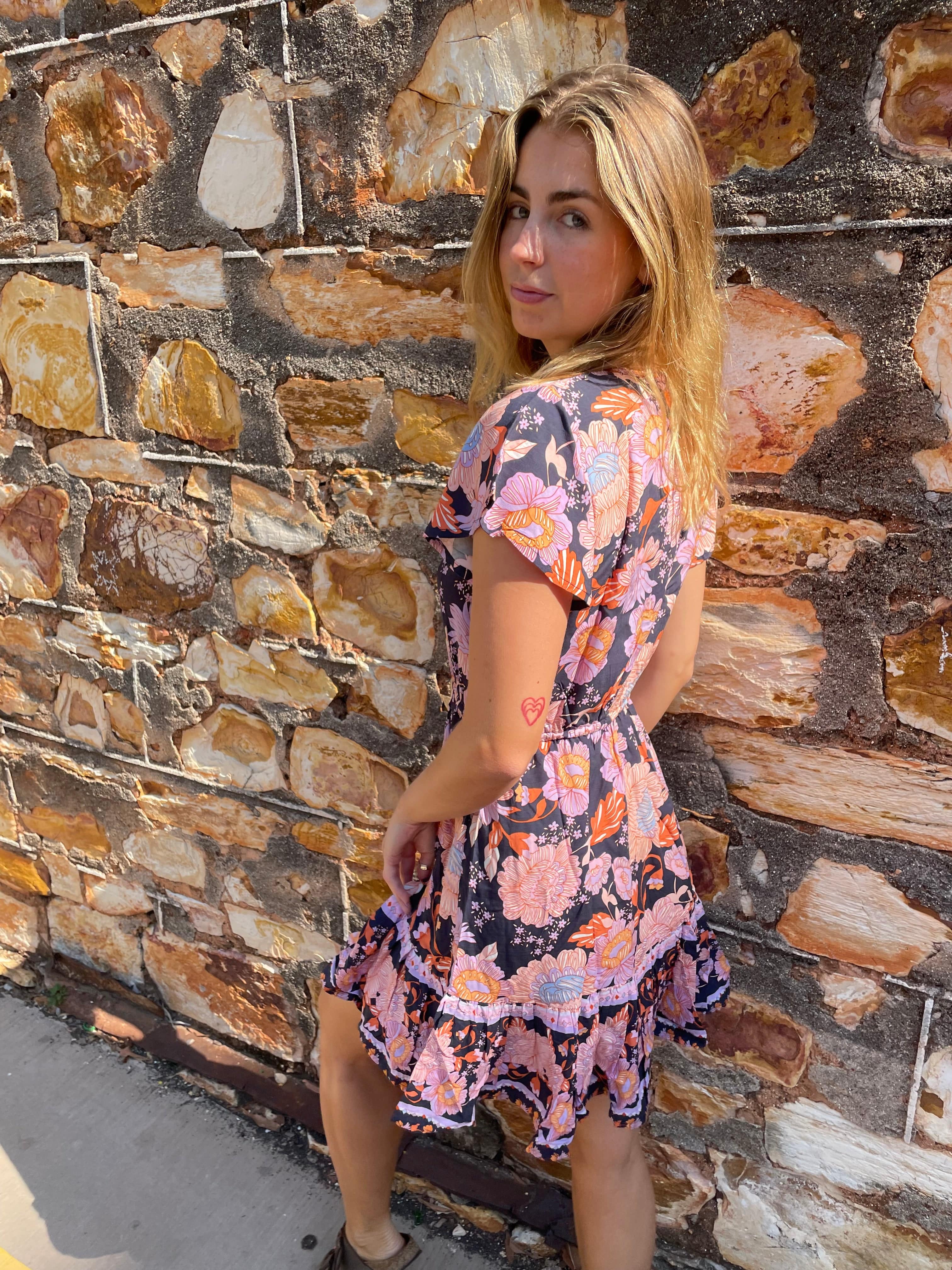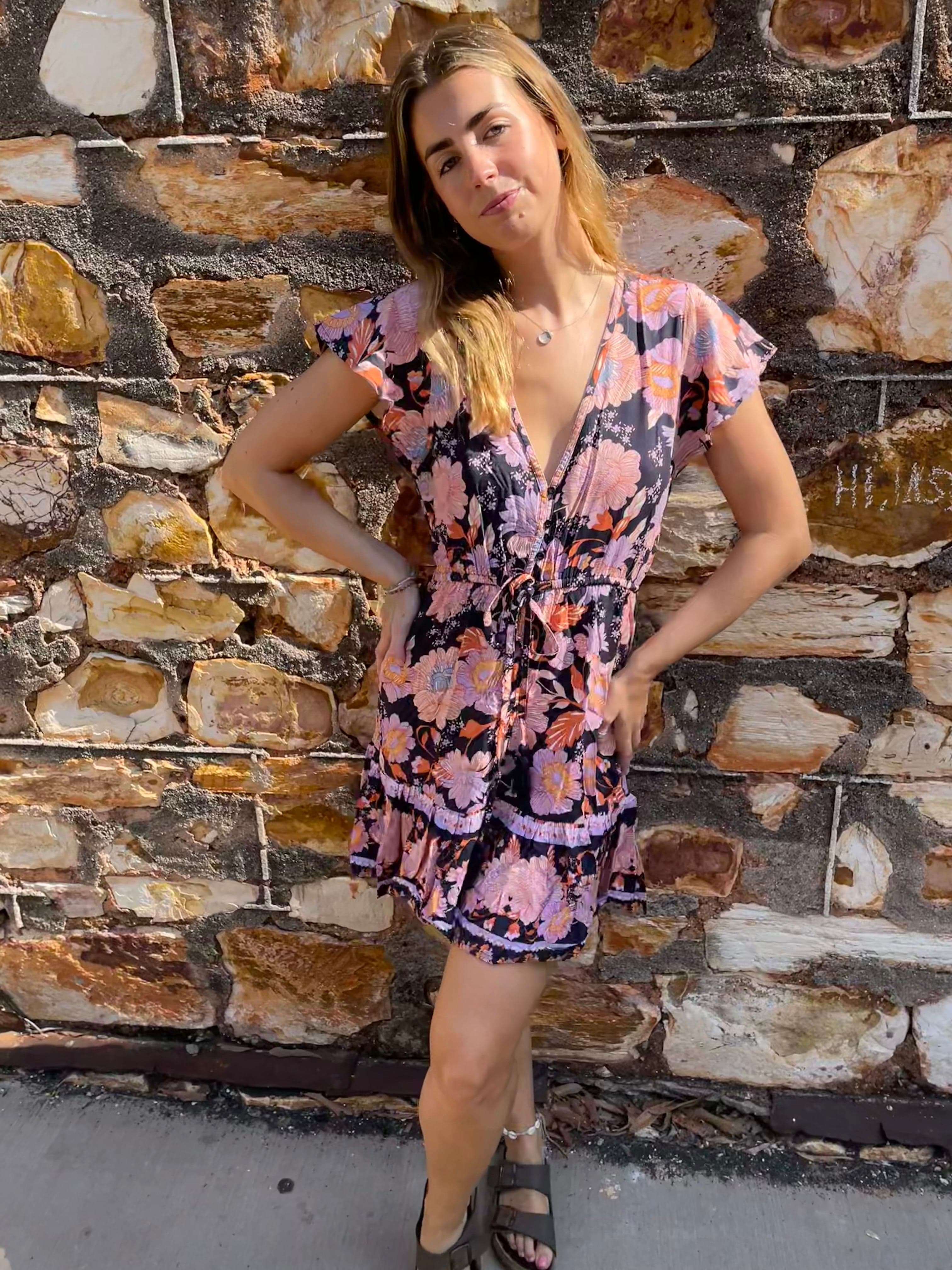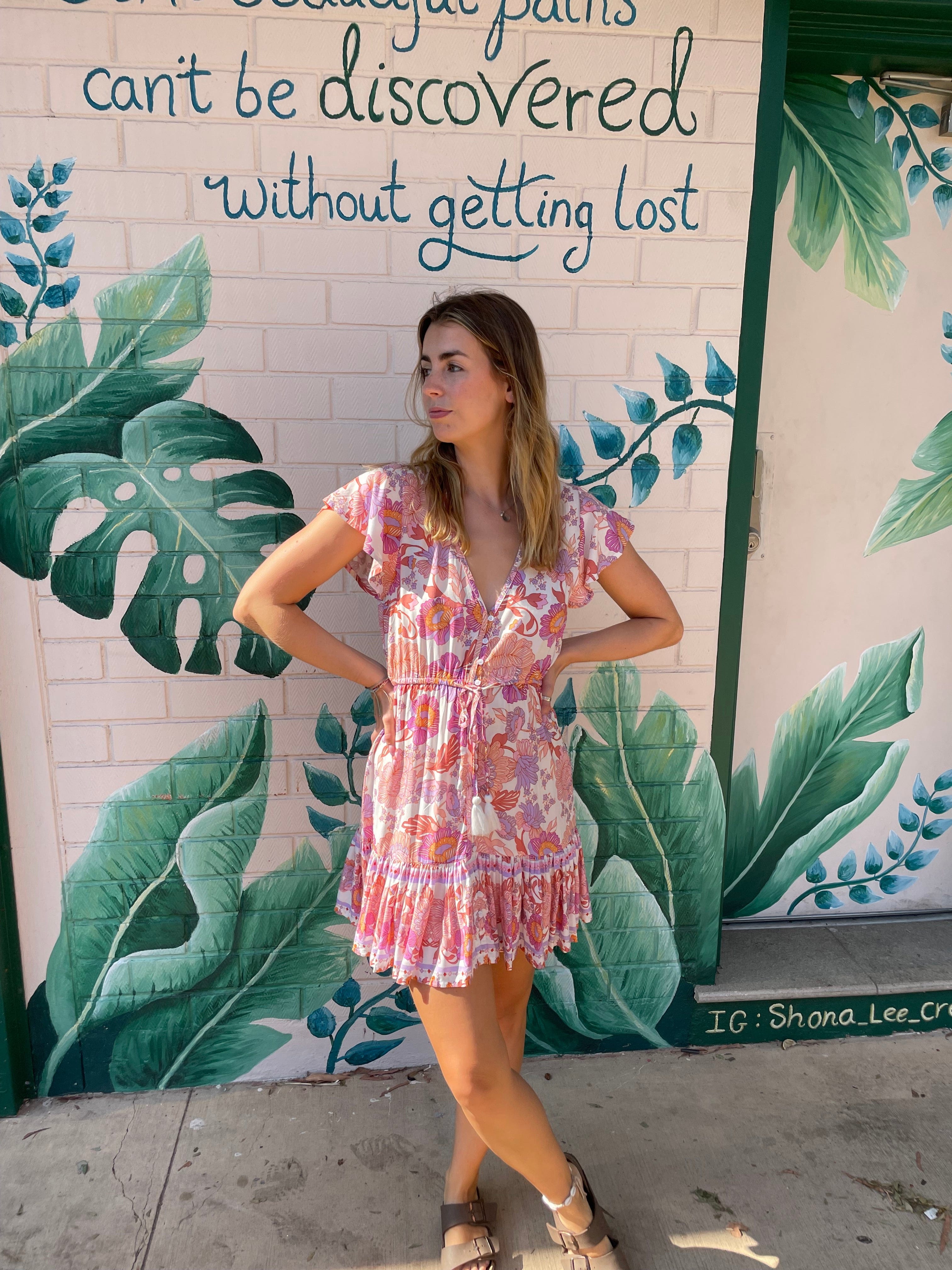 Our ever so popular Gypset dress has a drawstring waist and beautiful floaty hem with soft flutter sleeves.