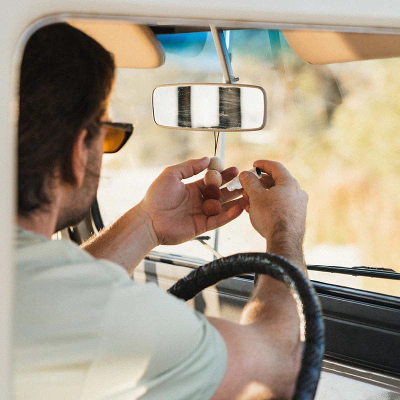 4 Unscented Ethically Sourced Wool Felt Balls with branded charm and elastic string for easy hanging.