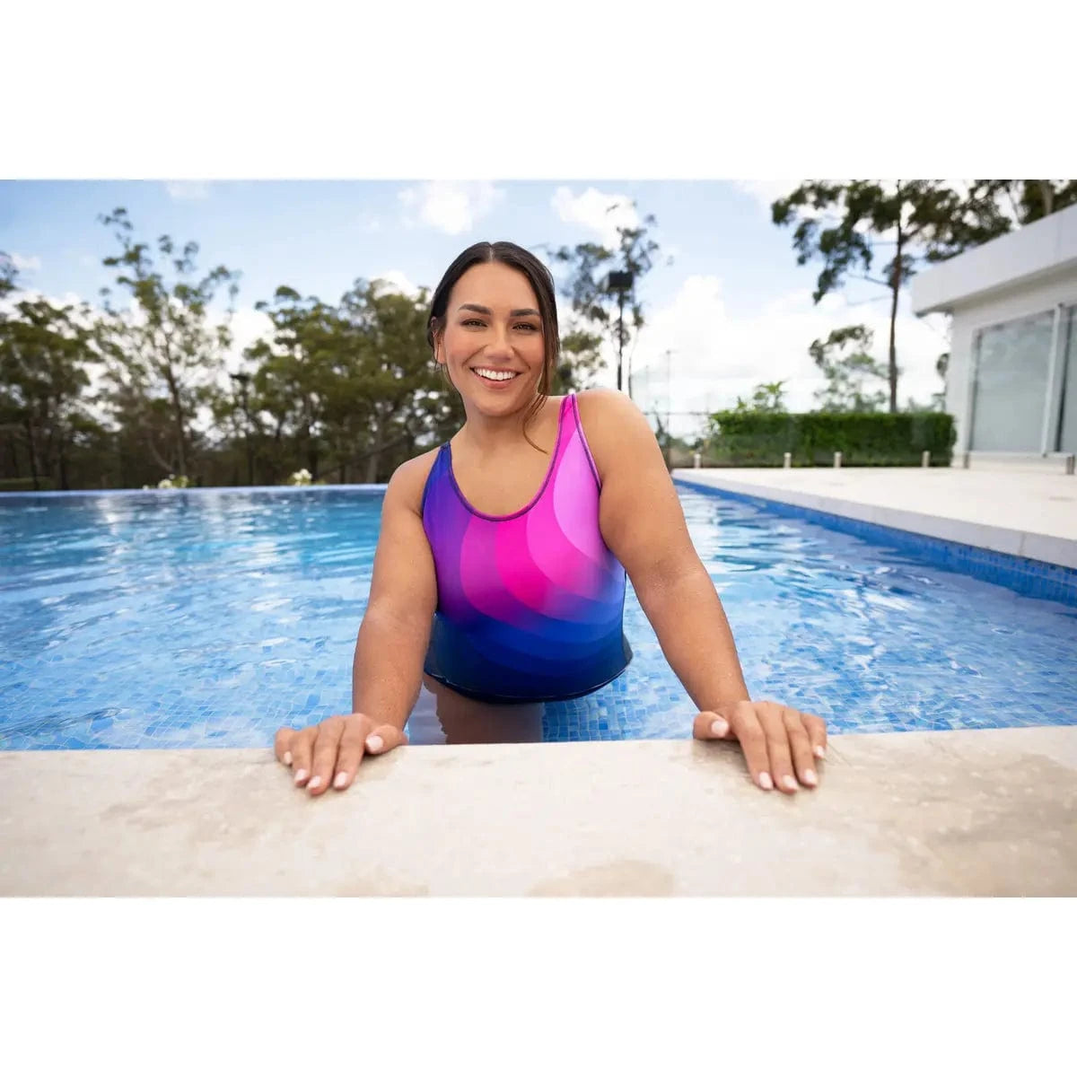 Dreaming of the perfect swimsuit? Zoggs Zephyr Scoopback is the perfect choice! The bright pink and purple patern adorns the front of the suit, swooping to the side to create a flattering silhouette.